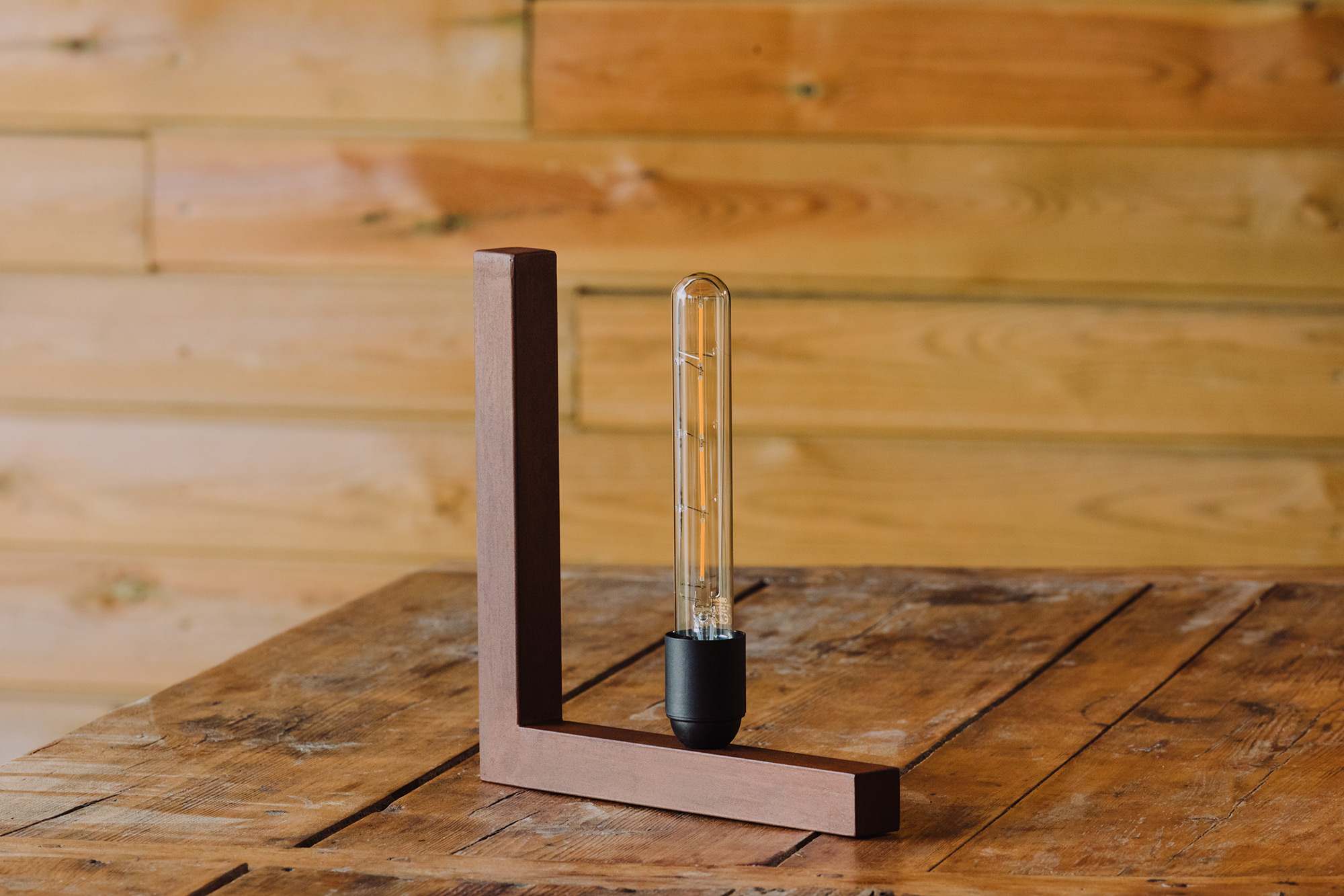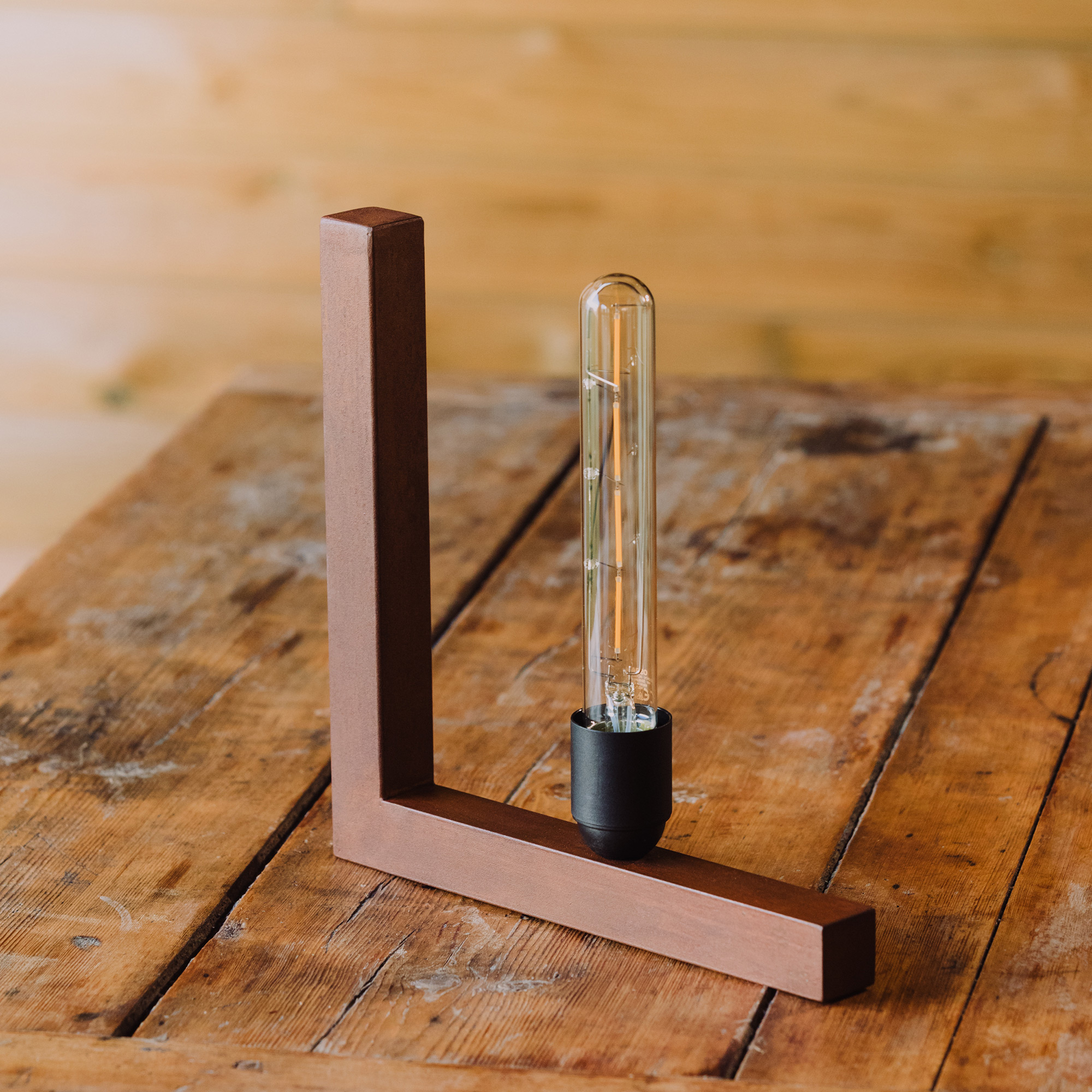 Llum de taula en forma de “ela” feta únicament de tub de ferro quadrat.